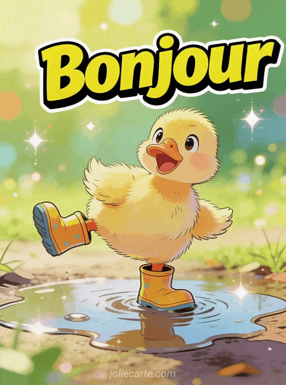 Faites sourire vos proches avec ce « Bonjour » drÎle et son caneton surpris en bottes de pluie. Complétez avec un bonjour saisonnier, un bonjour affectueux ou un bonjour artistique.