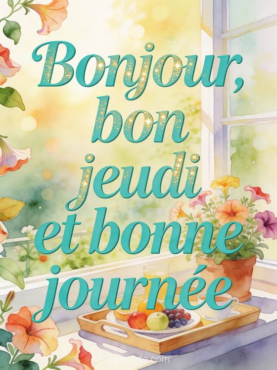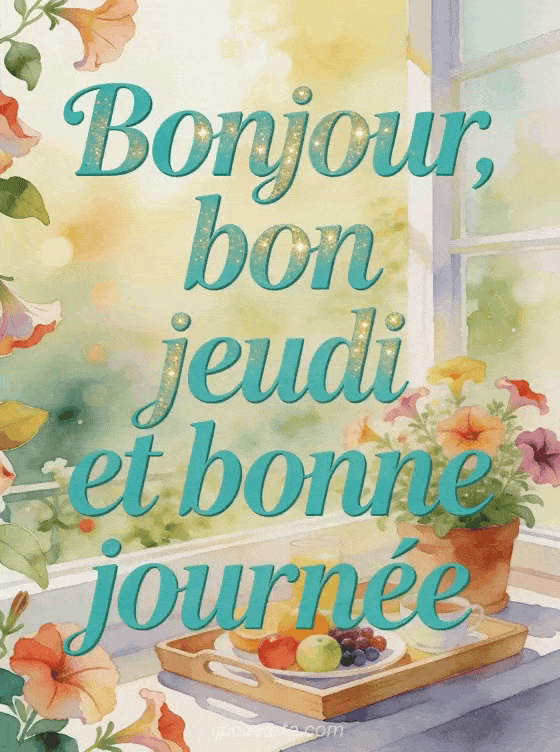 Bonjour et bonne journée de jeudi réunit le salut du matin et le souhait pour toute la journée. Cette carte accompagne un gif de bonne journée jeudi, garde l'optimisme de un bon jeudi malgré la pluie et rejoint un gif de jeudi éclatant.