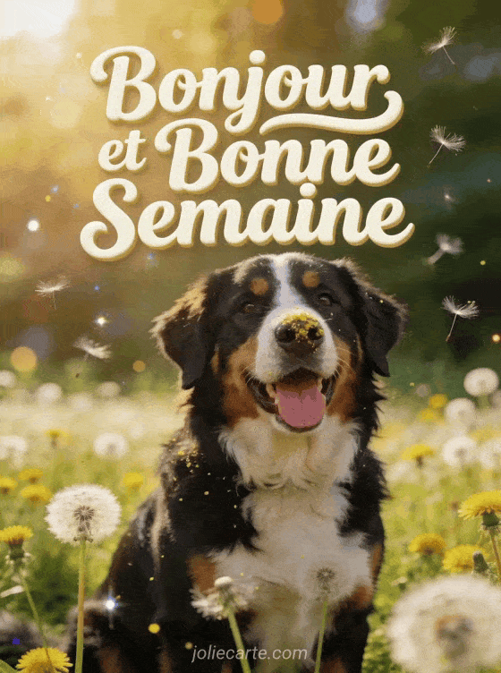 Cette photo amusante montre un bouvier bernois tirant la langue, assis dans un champ de pissenlits avec du pollen sur le nez. L'image parfaite pour commencer la semaine en rigolant. Retrouvez aussi notre arc-en-ciel aprÚs la pluie, notre canari mélodieux, ou cette citation inspirante.