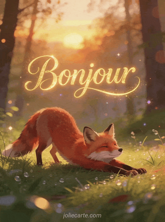 Partagez ce bonjour animé pour démarrer la journée avec le sourire. Un adorable renard s'étire dans la lumière dorée du matin. Pour varier les plaisirs, découvrez aussi un bonjour tendre, un bonjour collectif ou un bonjour festif.