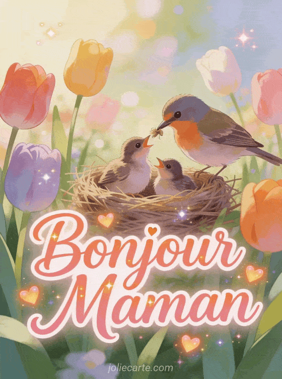 Dites bonjour à votre maman avec cette image pleine de tendresse. Un oiseau nourrit ses petits au nid parmi les tulipes colorées au lever du jour. Découvrez aussi un bonjour tendre, un bonjour affectueux ou un bonjour santé.