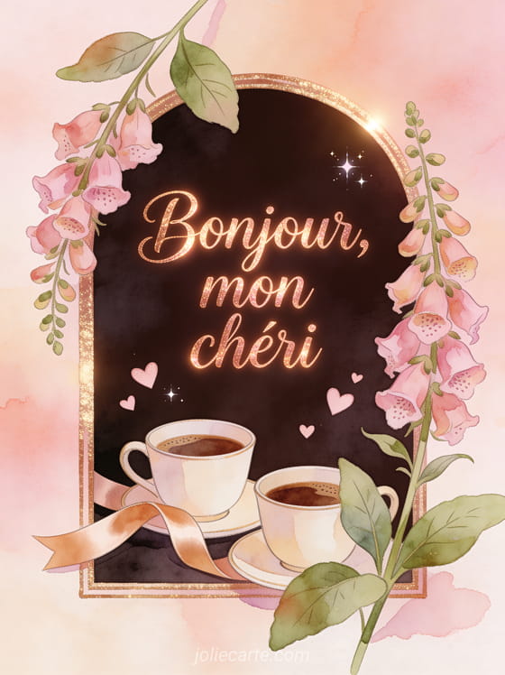 Bonjour mon chéri café transforme le premier message du jour en attention intime et tendre. Cette carte rejoint un matin café pour dire bonjour, prolonge un café bonjour avec du cœur et complète des photos café à partager.