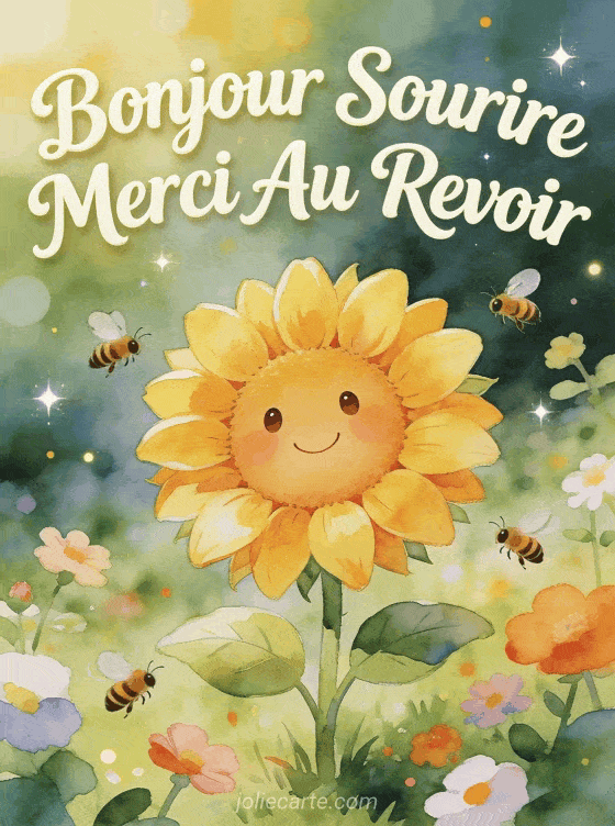 Ce tournesol joyeux au visage souriant dans son jardin ensoleillé incarne tous les mots gentils du quotidien : bonjour, sourire, merci et au revoir. Les petites abeilles qui l'entourent ajoutent à cette atmosphère de bonheur simple et de gratitude. Une carte pour répandre la joie. Découvrez notre carte drapeaux festive, ou des chouettes mignonnes. Notre carte étoile filante exauce les voeux.