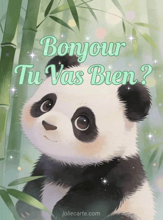 Montrez que vous vous souciez avec ce bonjour attentionné. Un adorable bébé panda penche la tête avec curiosité dans une forêt de bambous brumeuse. Découvrez aussi un bonjour élégant, un bonjour amical ou un bonjour collectif.