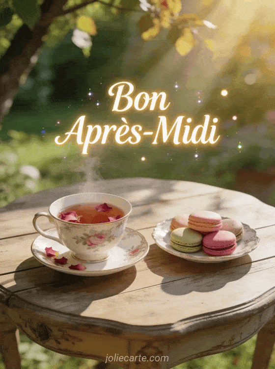 Cette image bon après-midi évoque la douceur d'une pause thé dans un jardin français ensoleillé. Un élégant service à thé vintage trône sur une table en bois, accompagné de délicieux macarons et de pétales de roses. Les rayons du soleil filtrent à travers le feuillage, créant une atmosphère de détente absolue. Parfaite pour inviter quelqu'un à profiter d'un moment de calme. Explorez aussi notre carte je te souhaite un bon après-midi, notre image bon après-midi mon amour ou notre carte passez un bon après-midi.