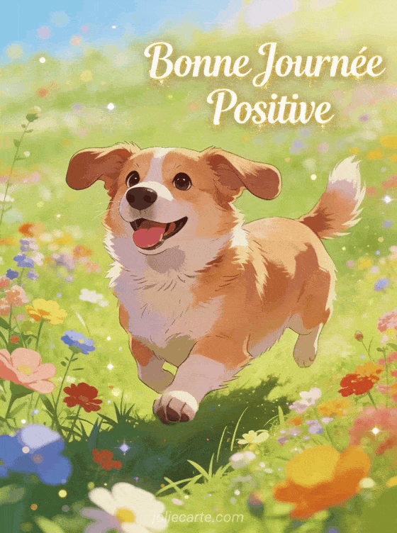 Bonne Journée Positive laissez-vous gagner par la joie de vivre de ce Corgi bondissant dans les fleurs.