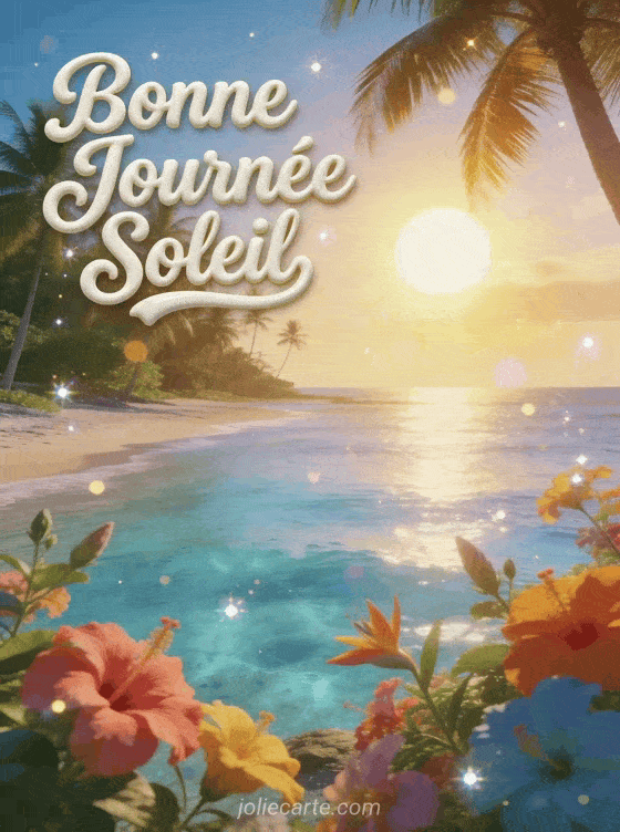Le soleil se lĂšve majestueusement sur une plage de rĂȘve bordĂ©e de palmiers, illuminant une eau cristalline aux reflets bleus. Des fleurs tropicales colorĂ©es parsĂšment le rivage, crĂ©ant un dĂ©cor de carte postale absolument idyllique. Cette image paradisiaque est parfaite pour envoyer un rayon de soleil et souhaiter une journĂ©e aussi belle qu'une escapade tropicale. DĂ©couvrez aussi notre carte bonne journĂ©e bon courage, notre carte bonne journĂ©e cafĂ© coeur ou notre carte sms bonjour bonne journĂ©e.