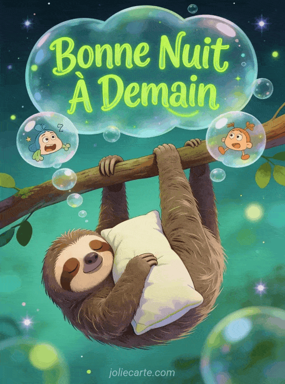Cette image « Bonne Nuit Ă Demain » version humoristique fera rire vos proches avant le coucher. Un paresseux rigolo avec son coussin incarne parfaitement la fatigue du soir. DĂ©couvrez aussi une nuit avec beaux rĂȘves, une autre carte humour ou nos crĂ©ations dĂ©calĂ©es.
