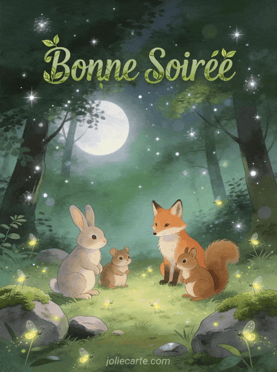 Cette carte bonne soirĂ©e avec animaux rassemble adorables crĂ©atures de la forĂȘt dans une clairiĂšre au clair de lune. FĂ©erique et attachant. DĂ©couvrez aussi notre bonne-fin-de-journee avec ourson, notre carte-bonne-soiree de rĂȘve et notre bonne-soiree-bisous tendre.