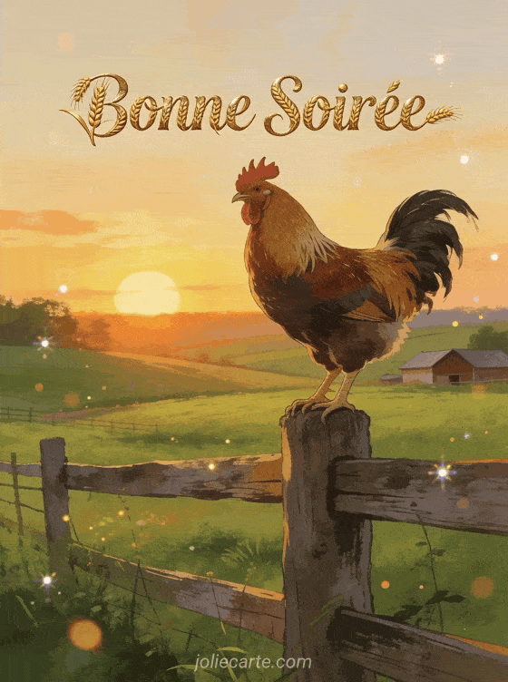 Cette carte bonne soirĂ©e coq met en scĂšne un fier volatile sur sa clĂŽture au coucher du soleil. Une image champĂȘtre pleine de charme rural. Explorez aussi notre profite-chaque-instant-douce-soiree poĂ©tique, notre carte-bonne-soiree de rĂȘve et notre bonne-soiree-bisous tendre.