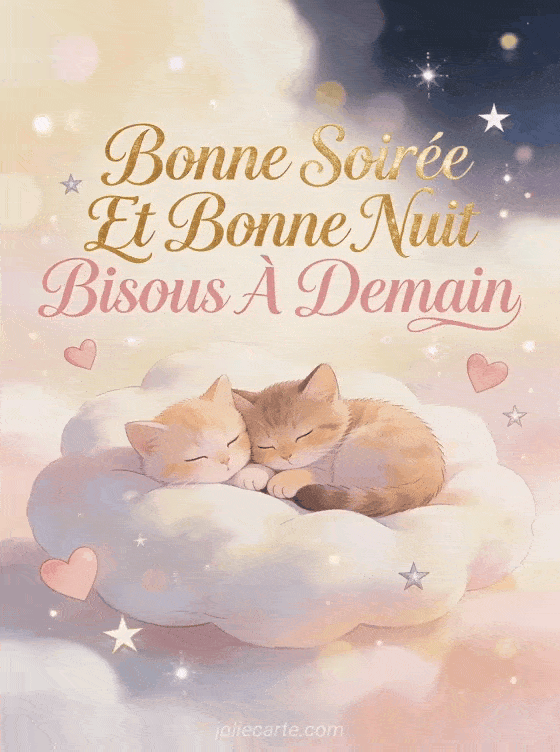 Cette image « Bonne Soirée Et Bonne Nuit Bisous à Demain » offre le message le plus complet et tendre. Deux chatons cùlins sur leur coussin nuage envoient des coeurs et des bisous pour vous accompagner toute la soirée. Découvrez aussi une soirée nuit bisous, un paysage du soir ou nos autres cartes adorables.