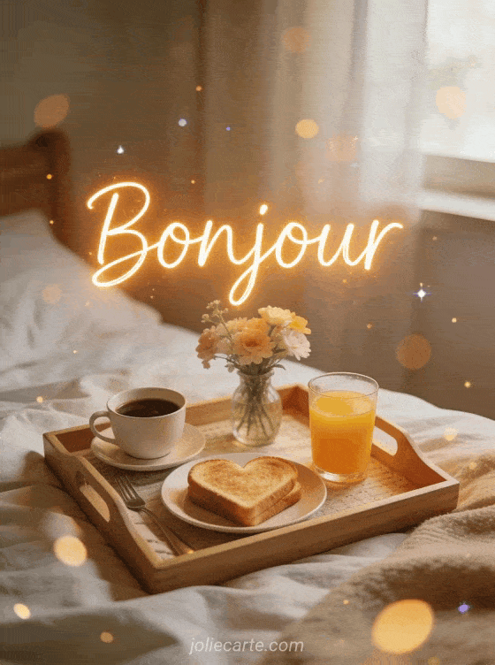 Partagez ce « Bonjour » romantique avec toast en forme de cĆur, cafĂ© et fleurs printaniĂšres. Variez avec un bonjour panoramique, un bonjour fĂ©erique ou un bonjour cosy.