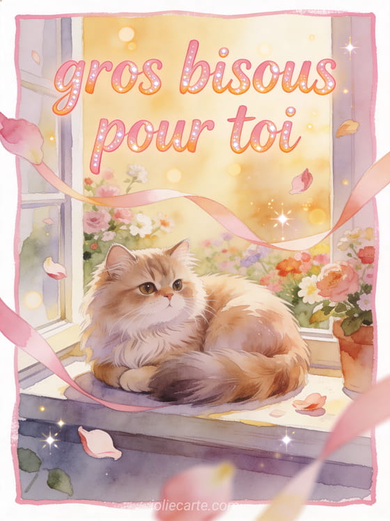 Cette carte chat qui envoie des bisous apporte une touche tendre et attendrissante a vos messages. Elle s'accorde avec un gif de bisous envoye par un chien, rejoint une image de bisous pour la famille et complĂšte des bisous accompagnes de roses pour varier les attentions avec douceur.