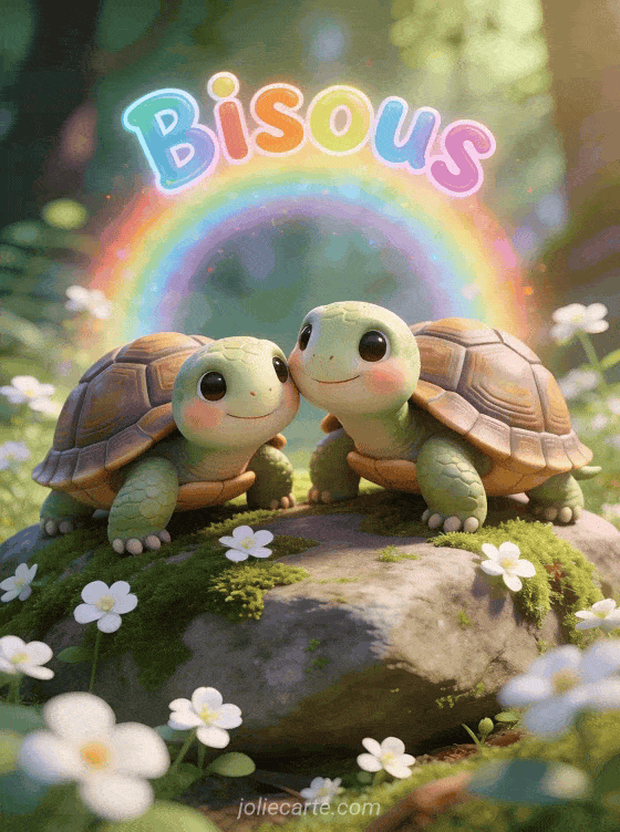 Partagez cette image « Bisous » avec des tortues adorables pour envoyer un baiser tout doux. Découvrez aussi un envoi de bisous, un bisou en dessin ou des bisous et café.