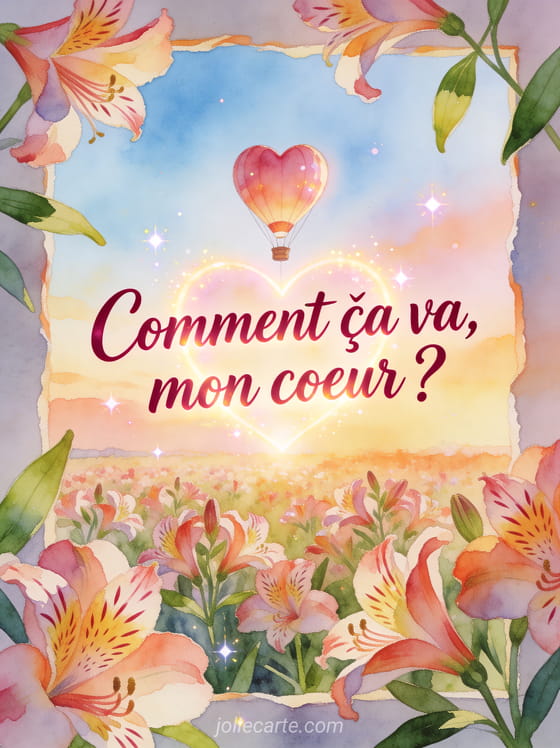 Cette carte comment ça va mon coeur invite à reprendre contact avec tendresse, dans un ton amoureux et rassurant. Elle rejoint une question douce pour son amour, peut suivre un bonsoir intime et attentionné et complète une demande pour savoir si tout va bien.