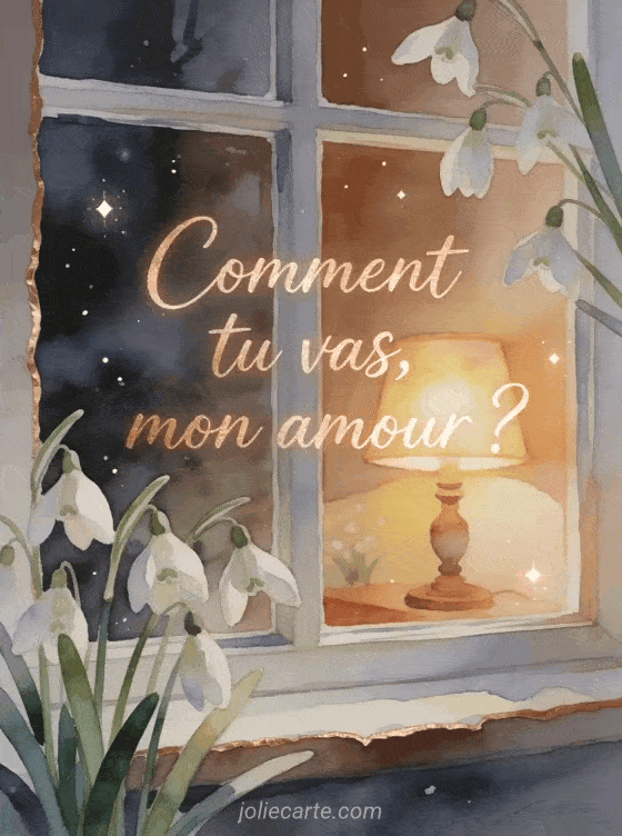 Cette carte comment tu vas mon amour pose une question simple et proche, idéale pour montrer que vous pensez à l'autre. Elle prolonge une reprise de nouvelles trÚs amoureuse, rejoint une attention douce pour ma chérie et complÚte une question tendre pour son coeur.