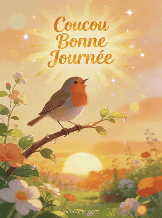 Partagez ce joyeux coucou bonne journée avec un rouge-gorge qui chante à l'aube. Parfait pour souhaiter une belle journée. Voyez aussi un abeille coucou, un coucou oisillon ou une image matinale originale.