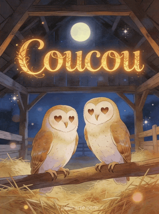 Partagez ce poétique coucou hiboux avec deux chouettes effraies au clair de lune. Une image apaisante et mystérieuse. Voyez aussi un coucou soleil, un coucou lapin ou une image hiboux originale.