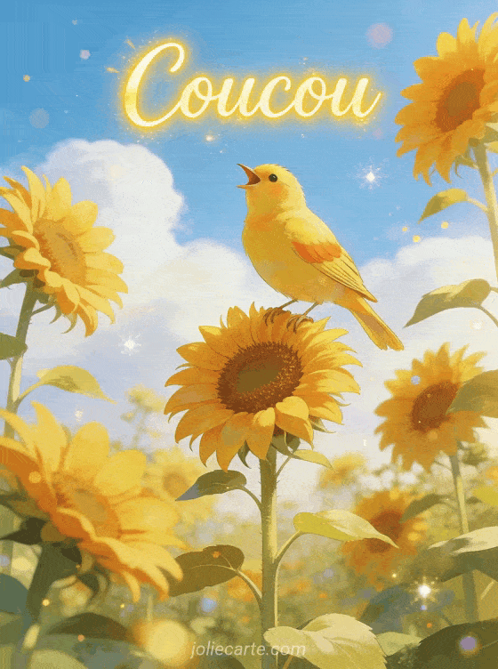 Partagez ce radieux coucou jaune avec un canari chantant sur un tournesol. Une image qui illumine la journée instantanément. Découvrez aussi un kikou le coucou, un coucou rigolo ou une image jaune originale.