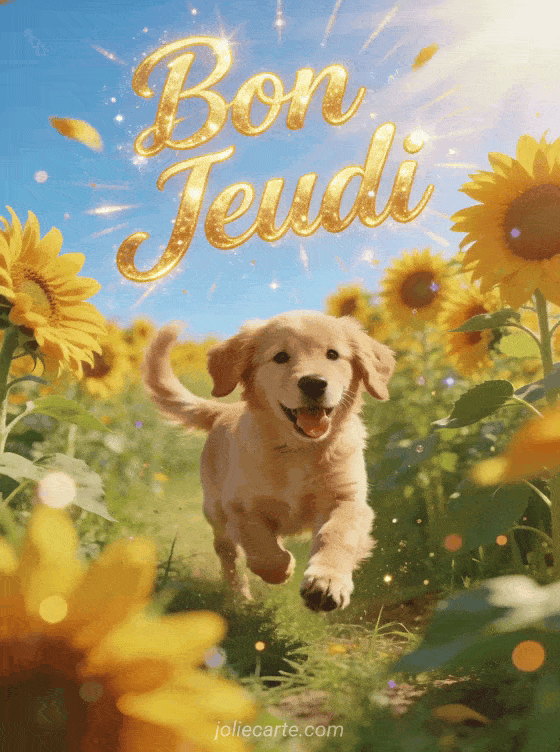 Cette image ensoleillé bon jeudi déborde de joie de vivre. Un golden retriever bondissant dans les tournesols incarne la bonne humeur. Variez avec un jeudi scintillant, un jeudi affectueux ou un jeudi café.