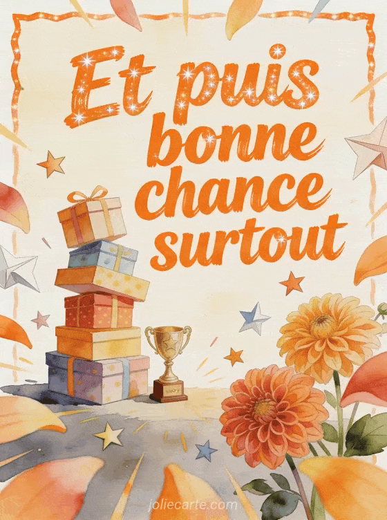 Un et puis bonne chance surtout gif apporte une touche d'humour à un vrai encouragement, pour accompagner une chance pour la suite, rebondir sur un gif d'examen ou envoyer un souhait de continuation sans solennité.