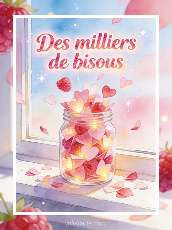Si tu veux un gif animé des milliers de bisous à partager sans compter, cette carte gratuite peut s'appuyer sur des bisous de nous trois, une corbeille pleine de bisous et un gif animé cheval bisous, afin de transmettre une attention abondante, tendre et joyeuse.