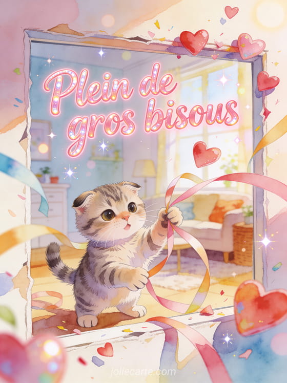 Un gif bisous chaton aide Ă transmettre plein de gros bisous avec une tendresse joueuse, tout en gardant une phrase naturelle entre des bisous trĂšs forts, des gifs de bisous avec animaux et un bisou furtif, pour partager une affection vive et attachante.