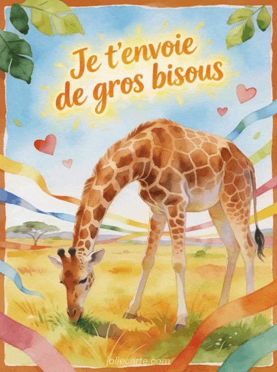 Ce gif bisous girafe permet d'envoyer un message tendre et amusant, en prolongeant des bisous version animaux, une tendresse façon peluche et de trÚs gros bisous à partager, pour offrir une attention originale, chaleureuse et légÚre qui fait sourire dÚs les premiers mots.