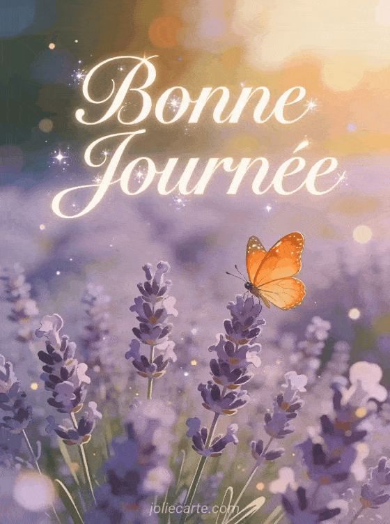 Gif Bonne Journée laissez-vous enchanter par ce papillon gracieux sur un champ de lavande ensoleillé.