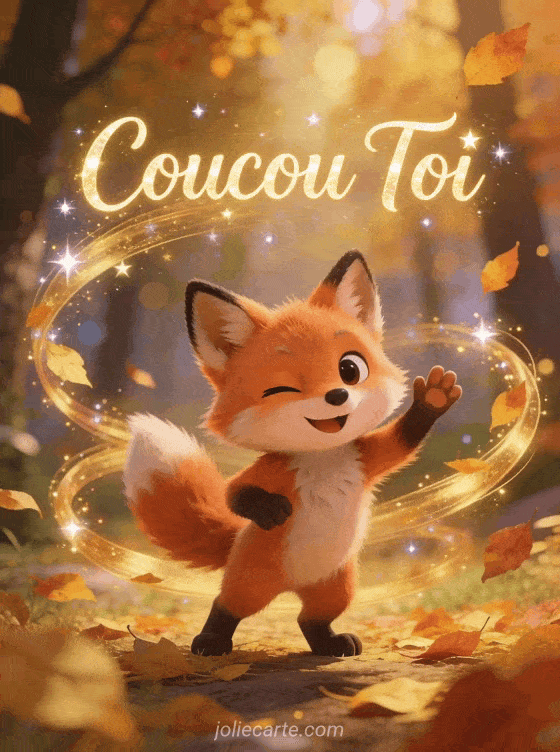 Partagez ce malicieux gif coucou toi avec un renardeau espiĂšgle qui fait un clin d'Ćil. Un message personnel et attachant. Voyez aussi un coucou noir, un gif coucou bisous ou une gif toi original.