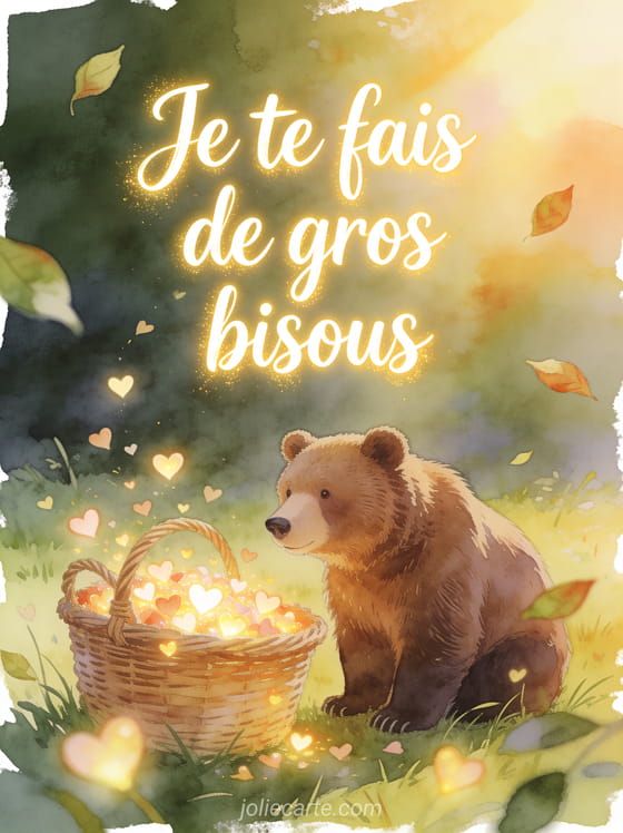 Envoyez un gif d'ours qui envoie des bisous pour faire sourire des les premiers instants. Cette carte gratuite s'accompagne aussi d'un herisson qui distribue des bisous animes, d'bisous qui voyagent partout et d'une image de bisous a partager pour varier vos attentions.