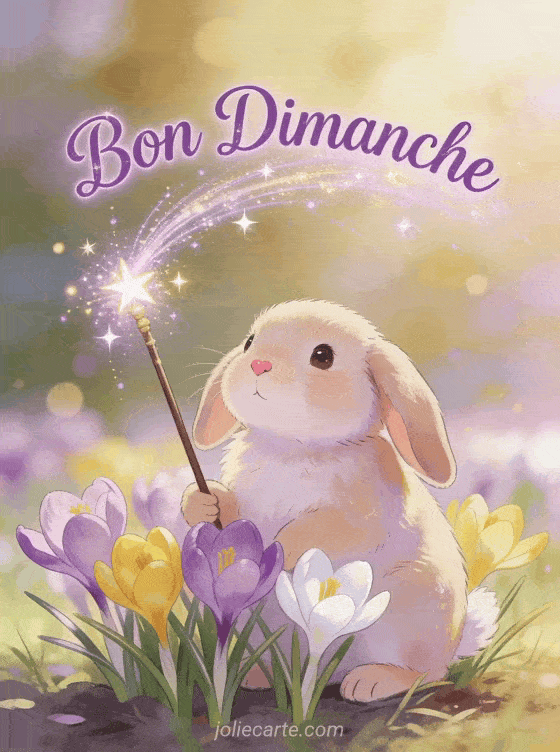 Craquez pour ce GIF bon dimanche avec un adorable lapin parmi les crocus printaniers. Une animation mignonne pour souhaiter un dimanche de renouveau à vos proches. Parfait pour un message printanier plein de douceur.