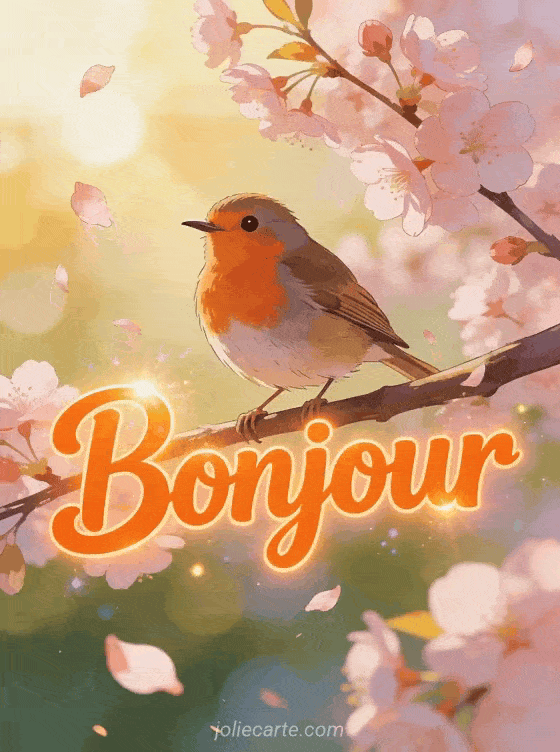 Saluez vos proches ce mercredi matin avec cette image poĂ©tique oĂč un rouge-gorge chante joyeusement perchĂ© sur une branche de cerisier en fleurs. Les pĂ©tales roses qui virevoltent dans la brise crĂ©ent une atmosphĂšre romantique et apaisante parfaite pour bien dĂ©marrer la journĂ©e avec une image de bon mercredi. Cette carte capture toute la fraĂźcheur et l'espoir du printemps dans une composition dĂ©licate idĂ©ale pour souhaiter un bon mercredi. Offrez ce moment de beautĂ© naturelle Ă tous ceux qui mĂ©ritent un peu de douceur, accompagnĂ© d'un gif de bon mercredi.