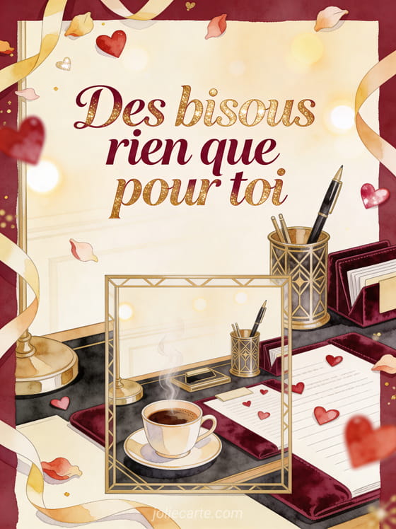 Gros bisous chef permet d'envoyer une attention complice, directe et chaleureuse, sans perdre en Ă©lĂ©gance. Pour ajuster le ton, ajoutez plein de bisous pour toi, des bisous pour de doux rĂȘves ou des bisous d'amitiĂ© animĂ©s Ă votre message.