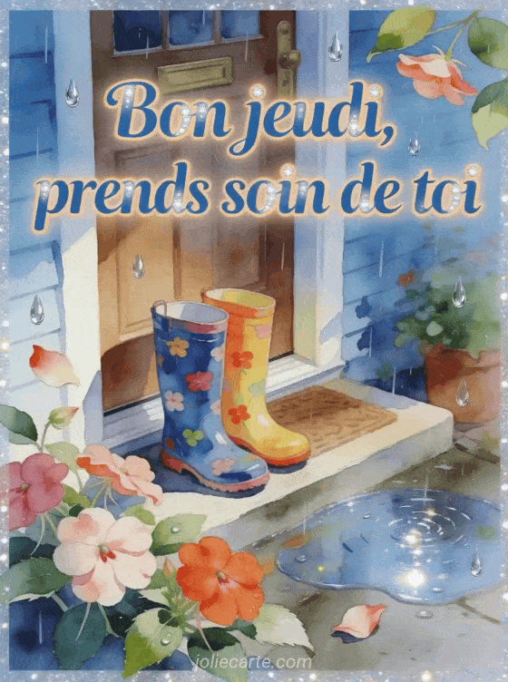 Il pleut bon jeudi sous la pluie transforme le mauvais temps en message attentionné. Cette carte peut accompagner un bon jeudi fleuri, prolonger un bonjour de jeudi et bonne journée et rejoindre des images de bonjour du jeudi pour prendre soin de l'autre.