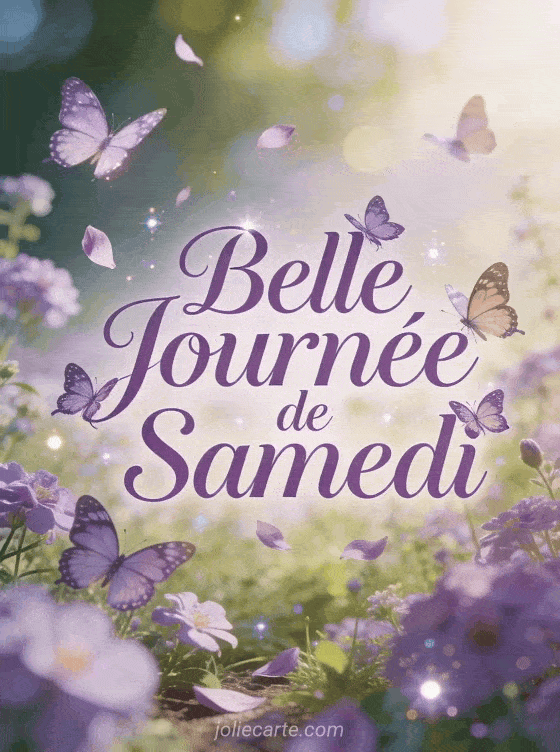 Laissez-vous enchanter par cette image belle journée de samedi magique. L'illustration présente un jardin aux papillons avec des fleurs violettes dans une scène matinale nature magique et féérique. Parfait pour un bon samedi ou un moment de magie.