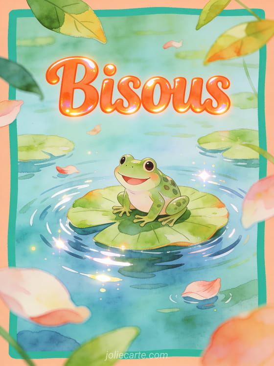 Pour envoyer une image bisous grenouille qui change un peu, cette carte gratuite peut se lire avec des bisous comme tu les aimes, plein de bisous partout autour et un message d'amitié avec bisous, afin de transmettre une attention tendre, légÚre et souriante.