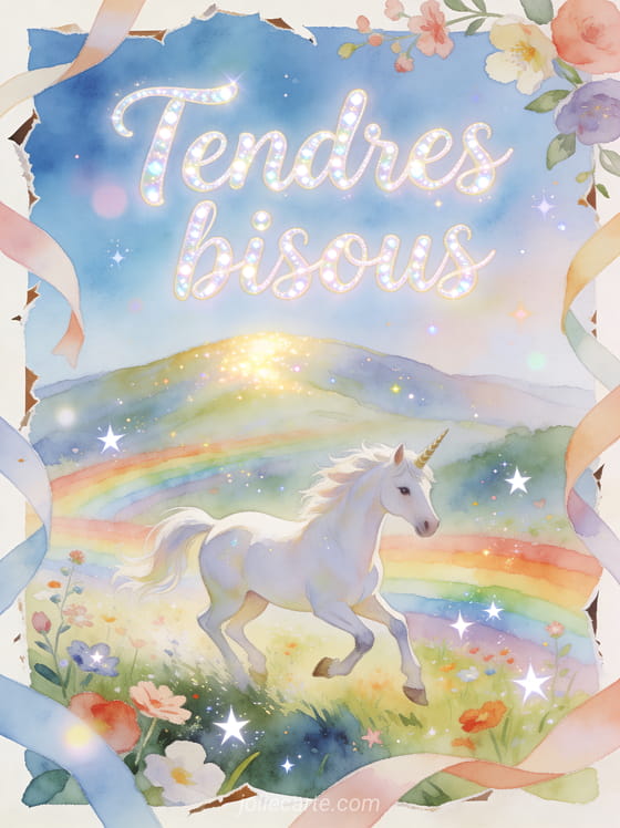 Une image bisous licorne est parfaite pour faire passer un message tendre avec une touche merveilleuse. Cette carte peut aussi se prolonger par des bisous version ours, des baisers à l'esprit lunaire ou des bisous pour redonner du courage selon ce que vous souhaitez transmettre.