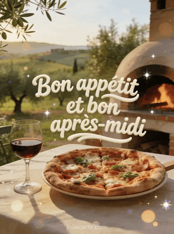 Cette image met l'eau à la bouche ! Une pizza rustique sortant du four à bois trône sur une table en plein air, accompagnée d'un verre de chianti. En arrière-plan, la campagne italienne s'étend avec ses oliviers centenaires, baignée dans la lumière dorée de l'après-midi. Découvrez aussi notre carte bon après-midi image, notre image merci bon après-midi ou notre carte souhaiter un bon après-midi.