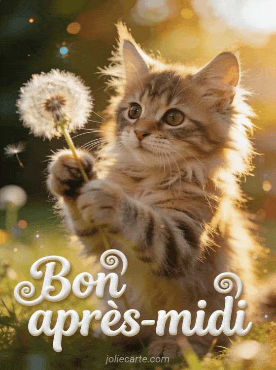 Cette image capture un moment de pure innocence. Un adorable chaton Maine Coon aux grands yeux curieux joue avec une fleur de pissenlit, sa fourrure duveteuse brillant dans la lumière dorée de l'après-midi. Le contre-jour sublime la scène, créant une atmosphère de magie et d'émerveillement. Voyez aussi notre carte images bon après-midi bisous, notre image merci et bon après-midi ou notre carte image bon appétit et bon après-midi.