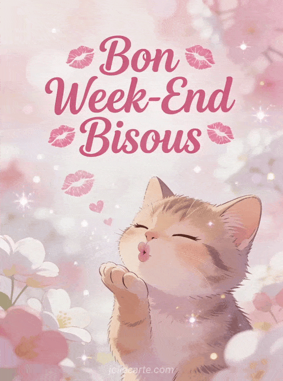 Partagez de la tendresse avec cette image Bon Week-End Bisous et son chaton calin. Explorez aussi une image fleurie, un gif dynamique ou un message tendre.