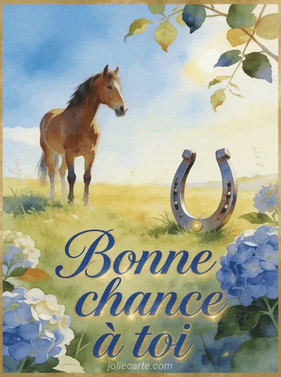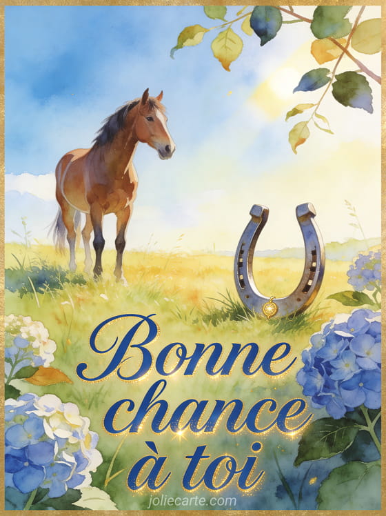 Une image bonne chance avec un cheval transmet une idée de force et de confiance, avec une carte de soutien, des cartes virtuelles porte-chance ou un souhait bref de réussite pour encourager sans détour.
