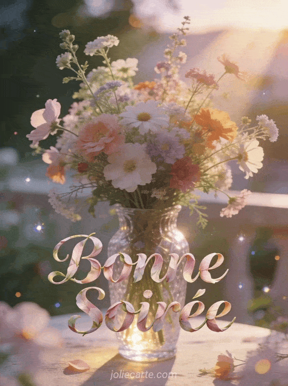 Cette image bonne soirée avec des fleurs présente un superbe bouquet de fleurs sauvages baigné de lumiÚre dorée. Une attention florale délicate. Découvrez aussi notre carte-bonne-soiree féerique, notre soiree-bonne tropicale et notre bonne-soiree-bien-meritee chaleureuse.