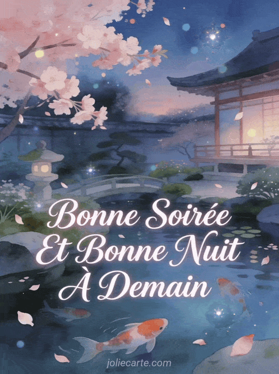 Cette image « Bonne Soirée Et Bonne Nuit à Demain » transporte dans un jardin japonais apaisant. Des carpes koï dans un bassin sous les fleurs de cerisier créent une atmosphÚre zen et poétique. Découvrez aussi une soirée nuit bisous, une soirée nuit avec chatons ou nos autres images zen.