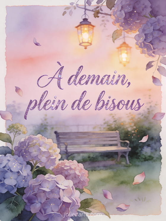 Image de bisous a demain garde une présence tendre au moment de se quitter pour la soirée. Cette carte accompagne un au revoir spontané avec bisous, prolonge une image douce avant demain et rassemble des images affectueuses pour se quitter.