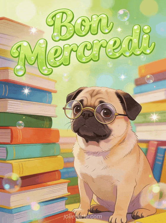 Commencez votre mercredi avec le sourire grùce à ce carlin hilarant qui arbore de petites lunettes rondes d'intellectuel entouré de piles de livres colorés. Son air faussement sérieux et studieux apporte une touche d'humour bienvenue pour partager une image de bon mercredi décalée. Cette scÚne amusante aux couleurs vives et à l'atmosphÚre joyeuse plaira à tous ceux qui aiment les images de bon mercredi originales. L'éclairage chaleureux et l'expression cocasse de ce petit chien savant en font un bon mercredi gif parfait pour détendre l'atmosphÚre.