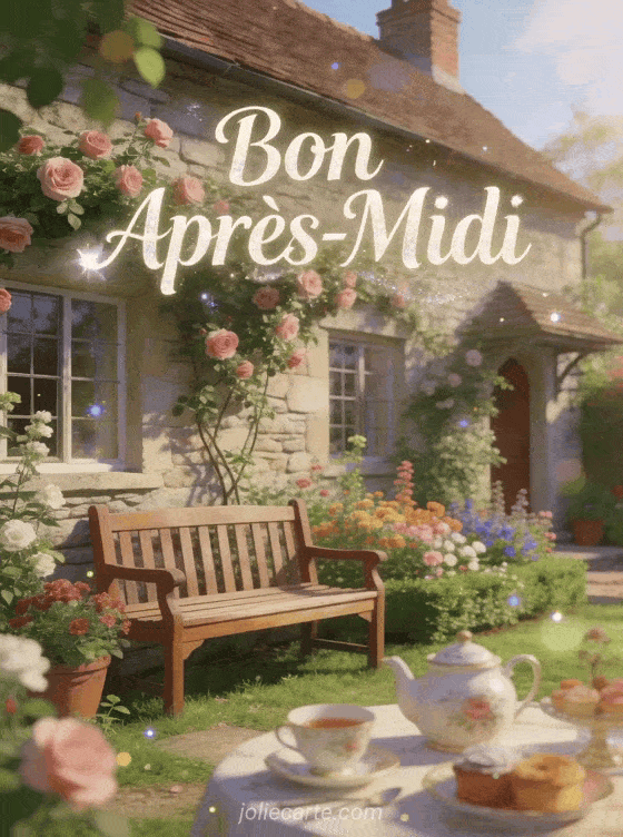 Cette illustration respire le charme de la campagne anglaise. Un jardin de cottage fleuri accueille un banc en bois sous des roses grimpantes qui habillent un mur en pierre. Des parterres colorés entourent un service à thé prêt pour la pause de l'après-midi. Voyez aussi notre carte gif bon après-midi, notre image bon appétit et bon après-midi ou notre carte passez un bon après-midi.
