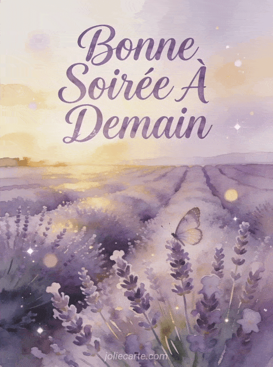 Cette image « Bonne SoirĂ©e Ă Demain » vous transporte dans les champs de Provence. Un papillon sur la lavande dorĂ©e par le soleil couchant offre une atmosphĂšre apaisante et parfumĂ©e. DĂ©couvrez aussi une soirĂ©e avec bisous adorables, une soirĂ©e tendre ou nos autres images champĂȘtres.