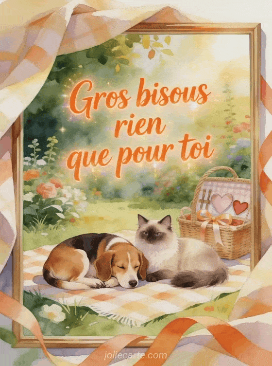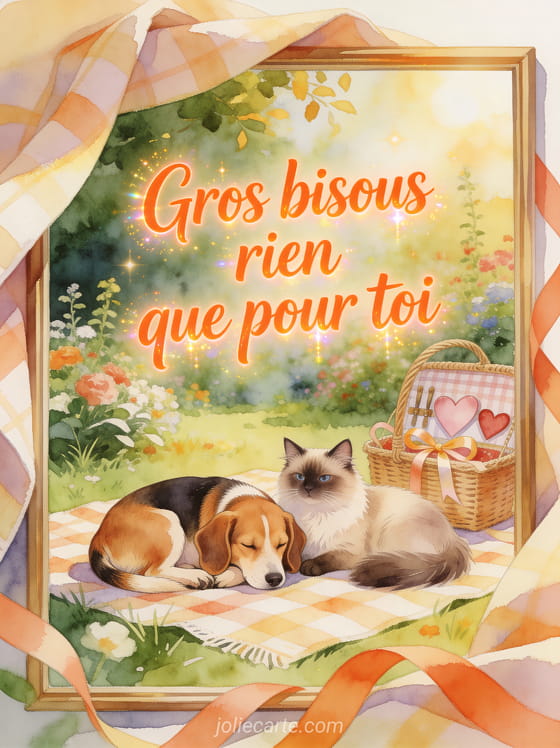 Pour envoyer des images gros bisous chien chat pleines de douceur, cette carte gratuite peut s'associer à des bisous façon panda, des bisous cÎté grenouilles et un gif pluie de bisous, afin de partager une attention complice, tendre et facile à faire parvenir.