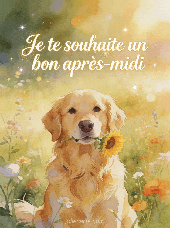 Je te souhaite un bon après-midi partagez ce message tendre avec cette illustration pleine de douceur d'un golden retriever dans une prairie ensoleillée.